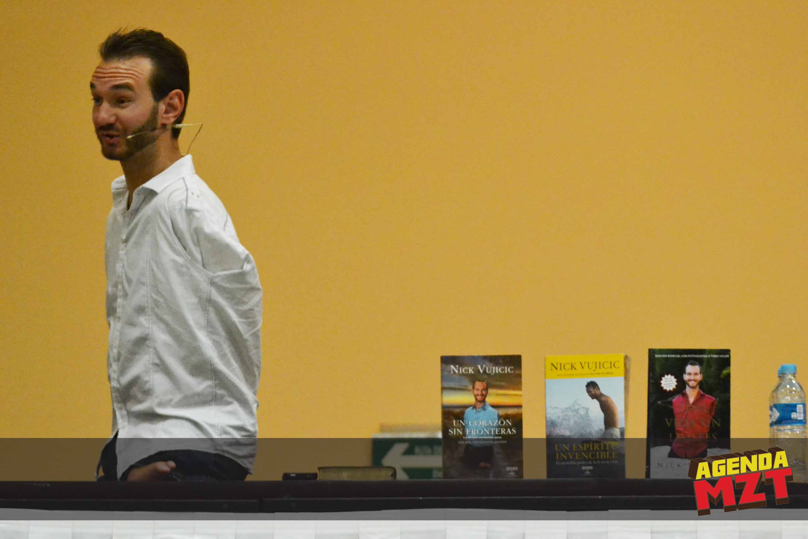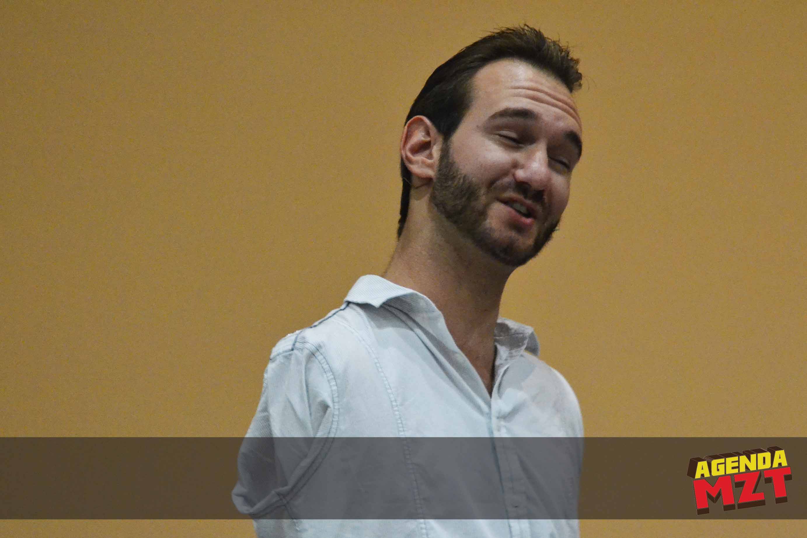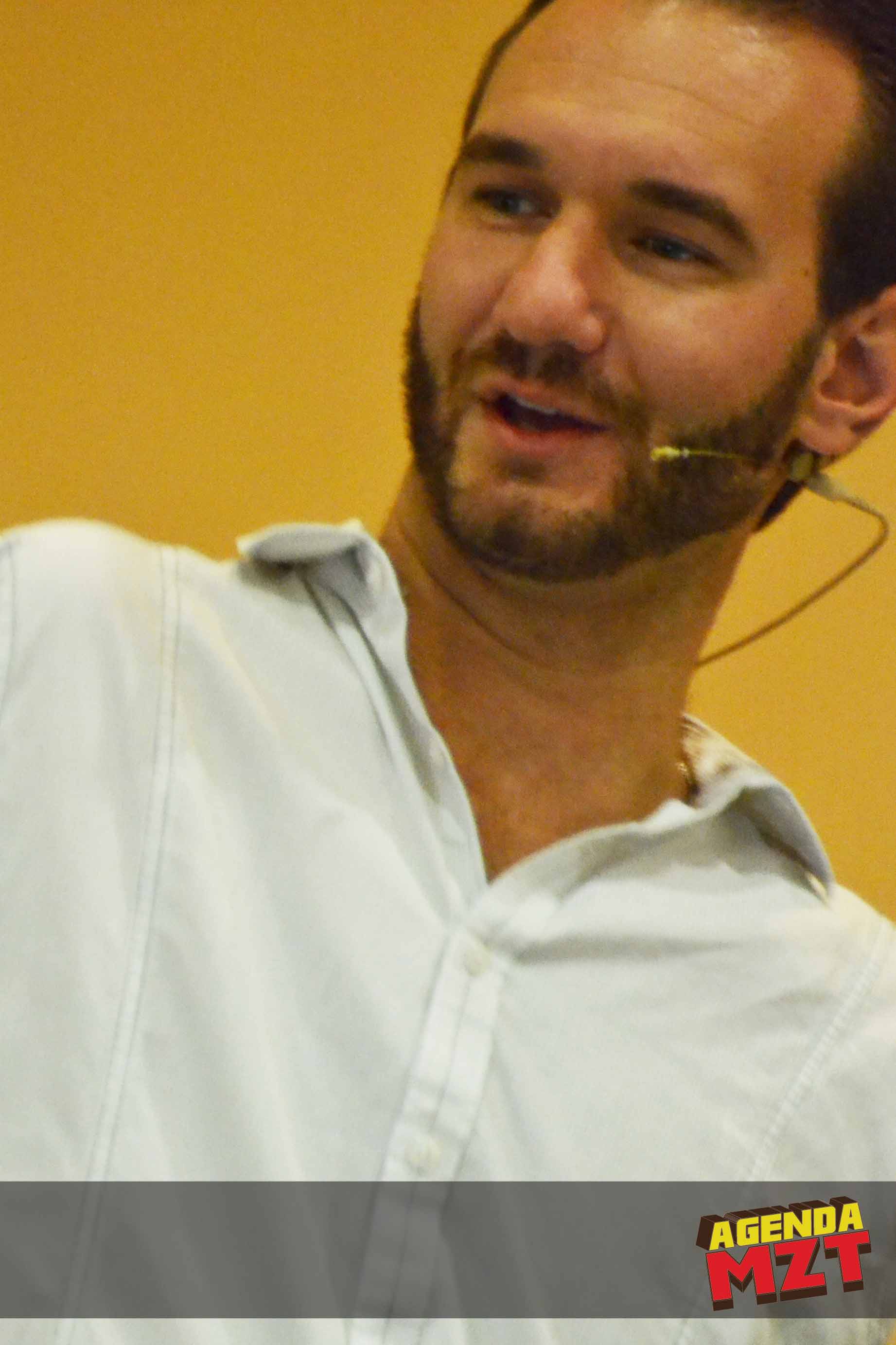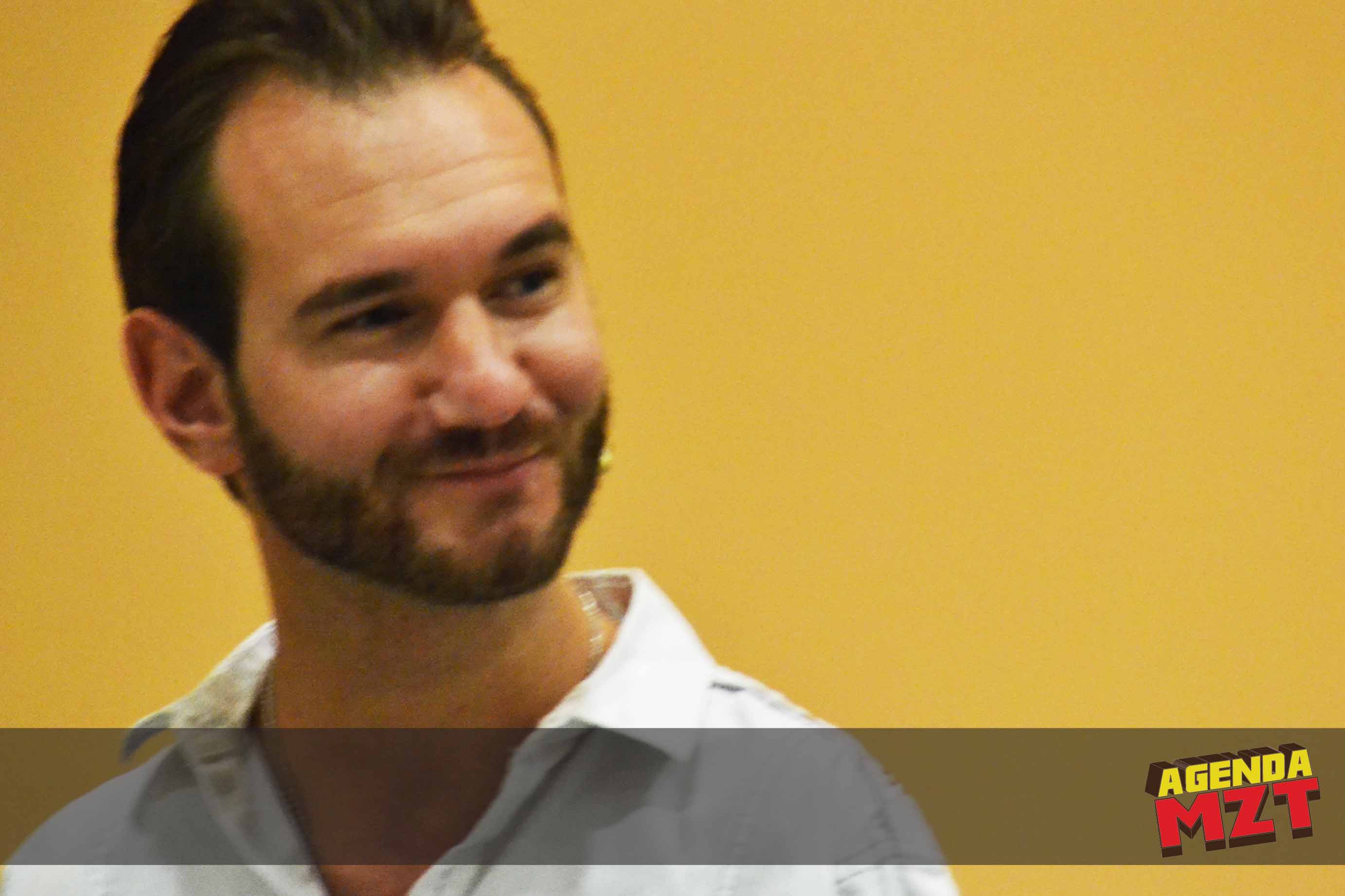 Se apagaron las luces en el salón principal del Mazatlán International Center, la audiencia empieza aplaudir; aparece Nick en brazos del personal de seguridad, sube al estrado y empieza el público a levantarse, los celulares y cámaras no paran de dar click!, era el joven que sin brazos ni piernas ha escrito dos best Sellers, ha protagonizado producciones cinematográficas y ha sido invitado al show de Oprah en dos ocasiones.