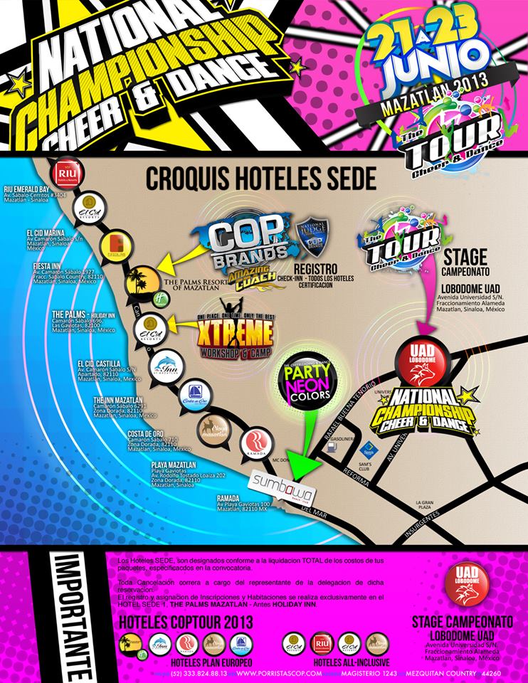 Para participar en el denominado “5° Campeonato Nacional de Cheerleading & Dance Coptour 2013” a celebrarse en este puerto de Mazatlán del 21 al 24 de Junio, arribarán a este puerto más de 6 mil competidores, entrenadores y atletas procedentes de Estados Unidos, Guatemala, Colombia y de 22 estados de México. Fortaleciendo y consolidando el turismo de convenciones, segmento en el que Mazatlán se ha convertido en un polo de atracción, este campeonato se llevará a cabo en el Lobodome de la Universidad Autónoma de Durango y consistirá en el concurso de porristas y la implementación de cursos para la certificación anual de jueces y entrenadores en esta disciplina. A partir del mañana, estarían arribando a Mazatlán 24 jueces de Minneapolis, Arkansas, Sacramento, Los Ángeles, Texas y Orange, Estados Unidos, así como también procedentes de Guatemala y Colombia. Asimismo cerca de 5 mil 700 participantes de los diferentes estados de México y 278 de Mazatlán estarían concentrándose en 7 hoteles que han sido asignados como sede de este evento internacional. De acuerdo con el programa previsto, las agrupaciones de porristas y de ejercicios de conjunto competirán en las categorías de Small Dance (niños menores de 6 años), Jazz, Hip-Hop, Pom-Pom, Cheer, y en categorías individuales. La mayor parte de equipos participantes serán de Sinaloa, Jalisco, Sonora, Tamaulipas, Chihuahua, Durango, Estado de México, Nuevo León, Baja California Norte, Coahuila, Colima, Nayarit, Morelos, Aguascalientes, Guanajuato, Zacatecas, Baja California Sur, Guerrero, Hidalgo, Michoacán, Puebla y Querétaro. CCCYa viene Cineseptiembre… y trae la Muestra CCC 2013